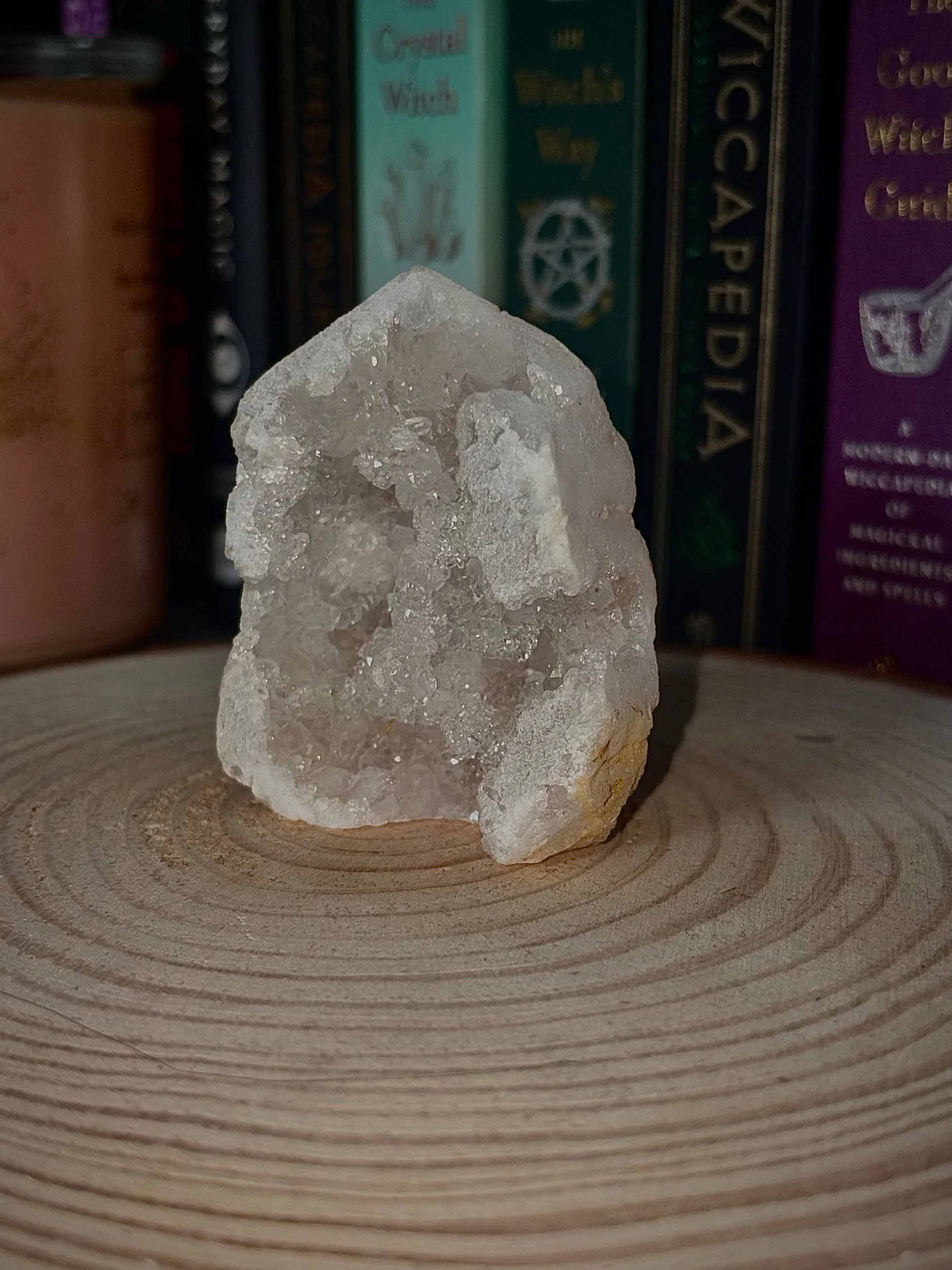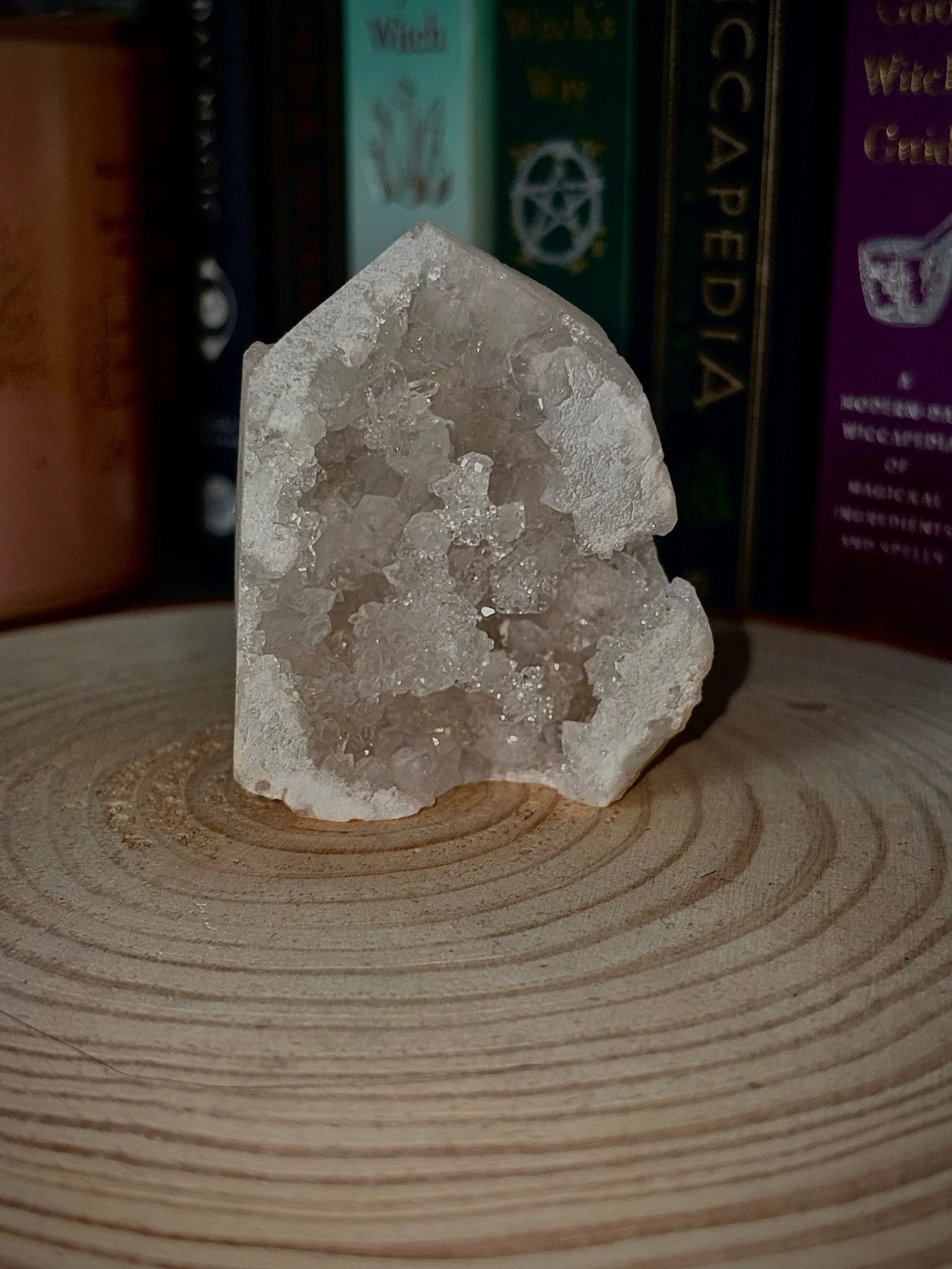 This clear quartz geode tower combines smooth, polished points with a raw, sparkling druzy centre — a beautiful contrast between refinement and natural formation. The crystal catches the light effortlessly, creating a soft shimmer from within.