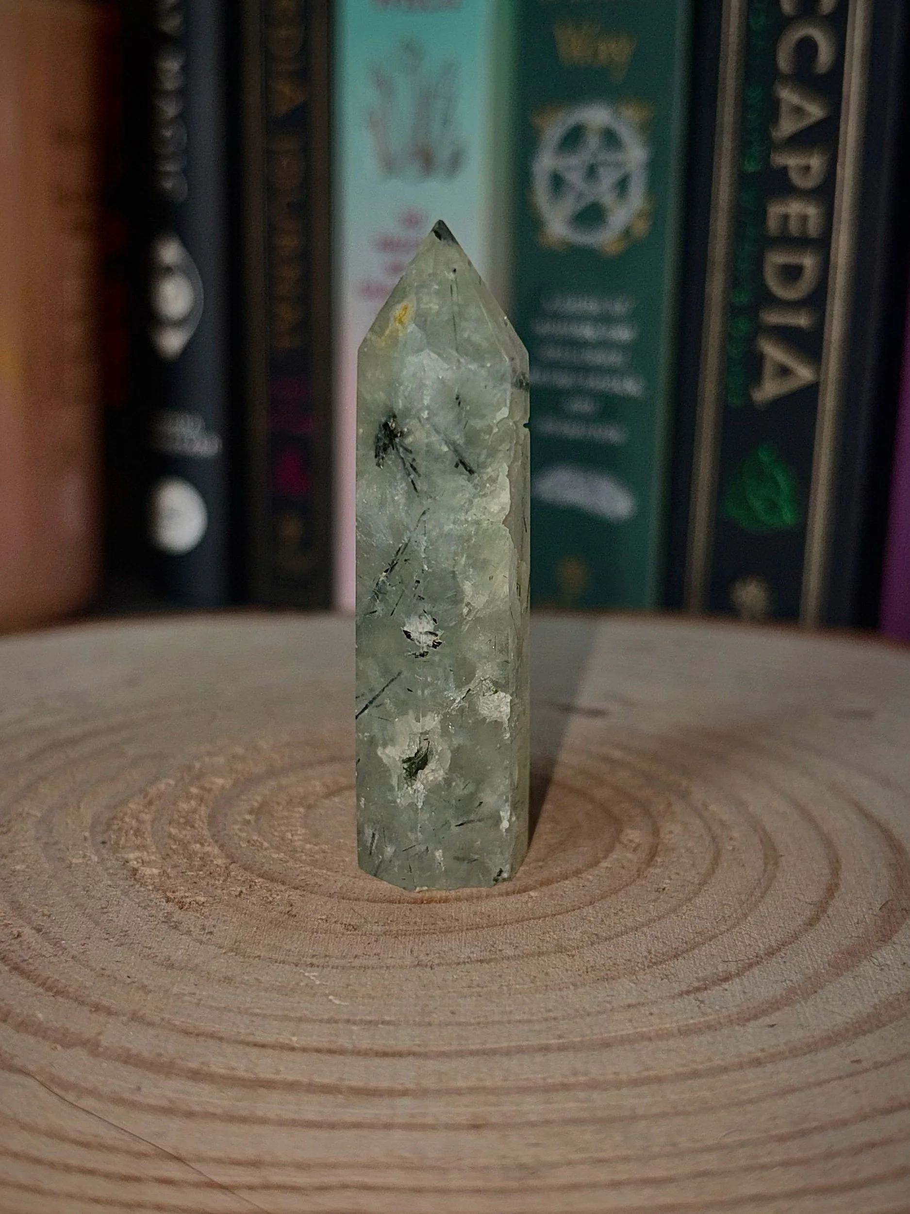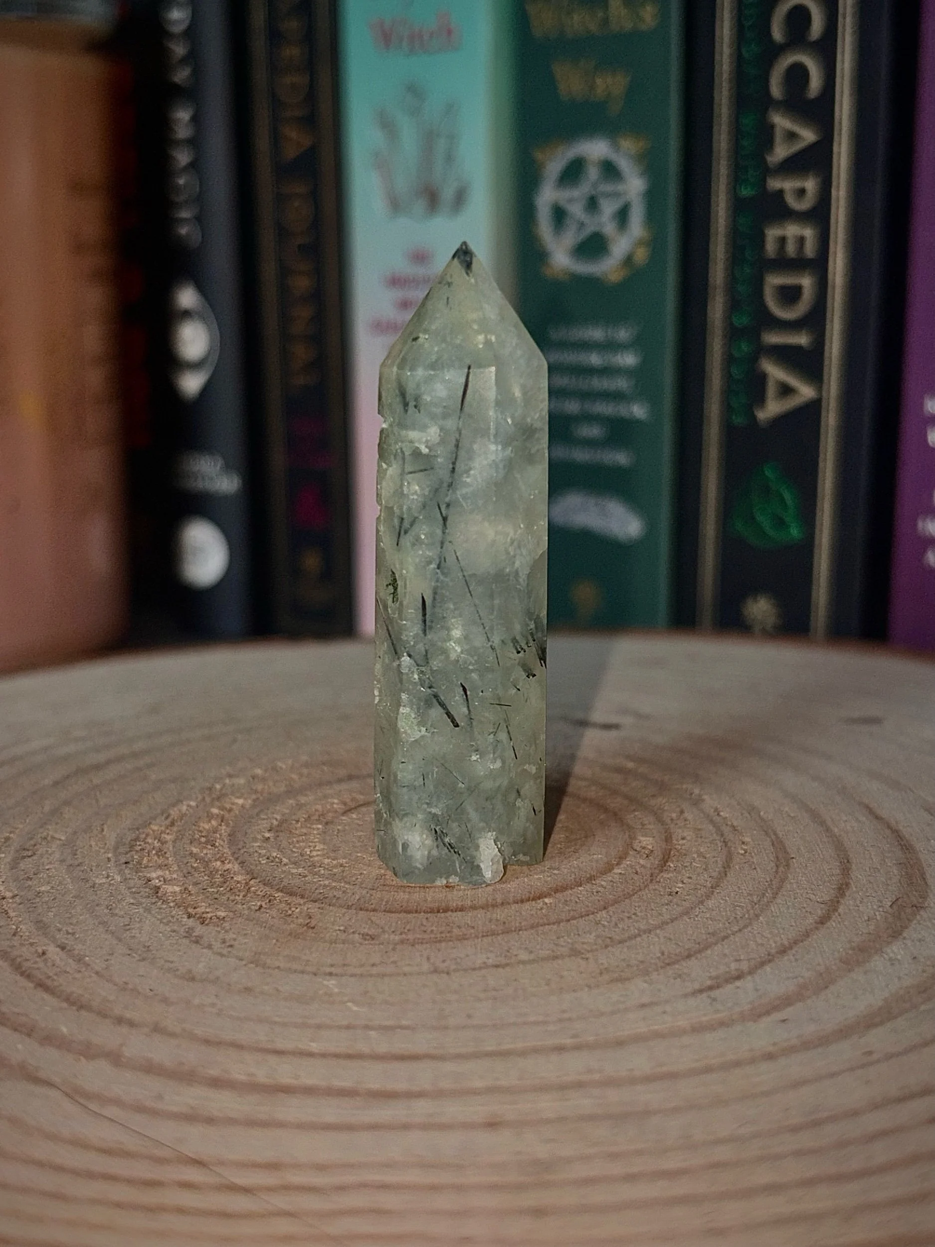 This prehnite tower carries soft, translucent green tones, threaded with natural black tourmaline inclusions — a striking contrast of light and dark, calm and protection. Each piece is completely unique, shaped by the earth with its own patterns and energy.