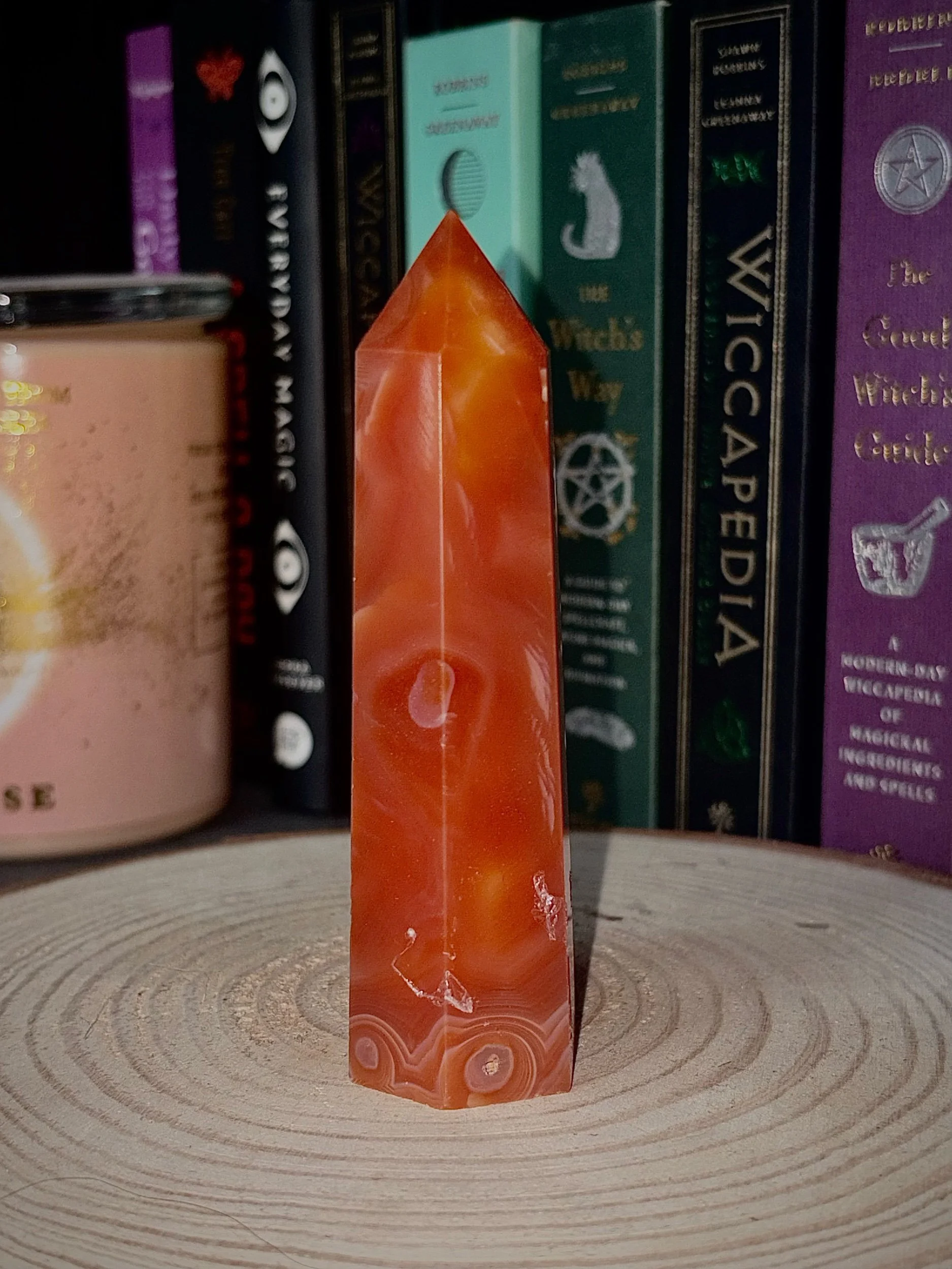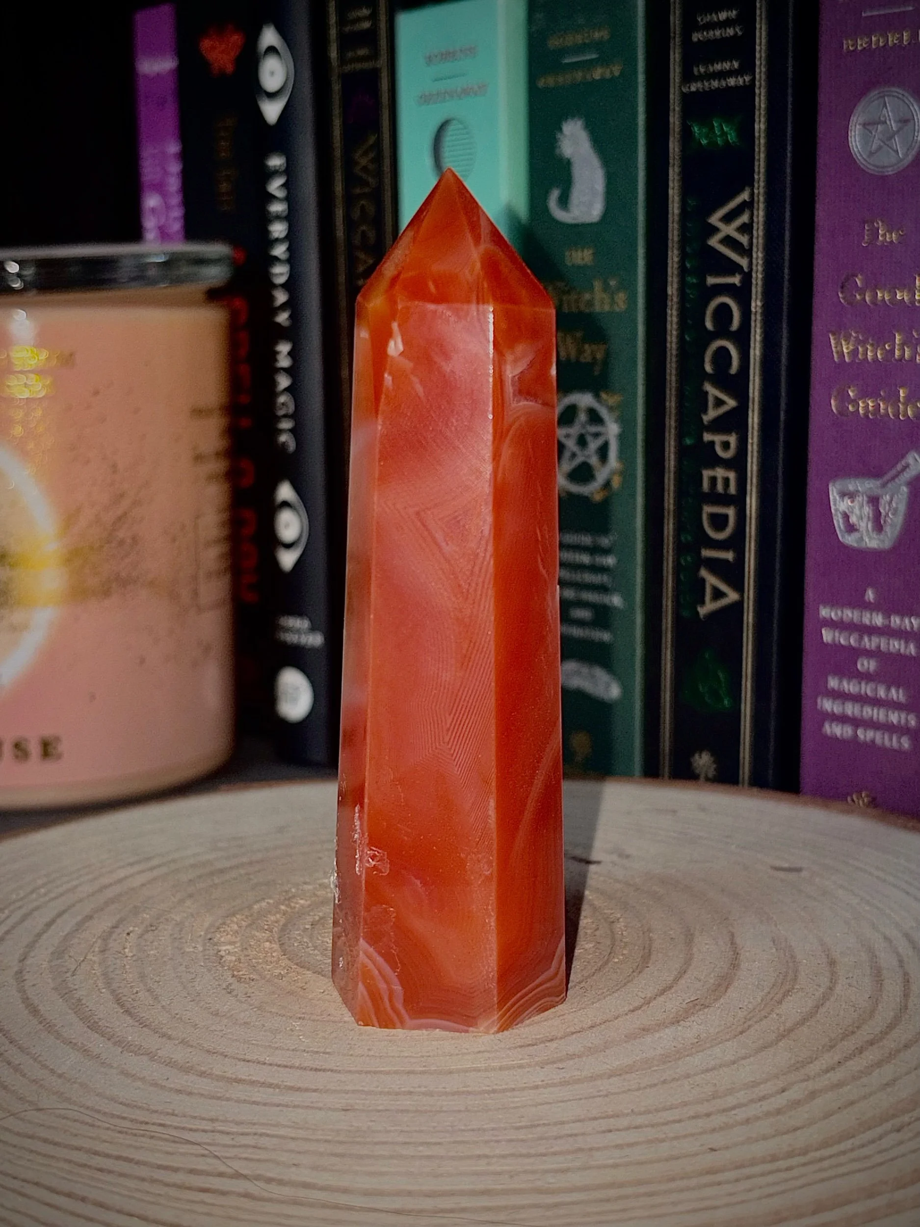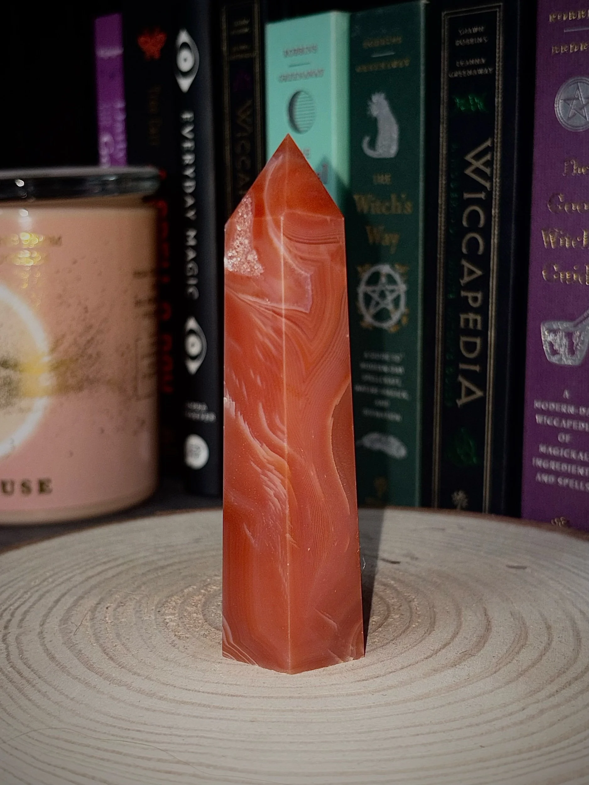 This carnelian tower glows with rich, warm tones of orange and amber, layered with natural banding and delicate druzy pockets that catch the light like hidden embers. Each piece is completely unique — a blend of softness and strength shaped by the earth.