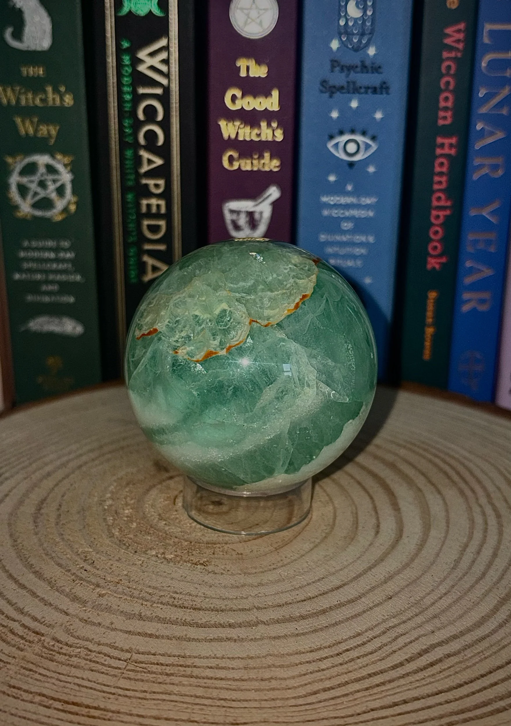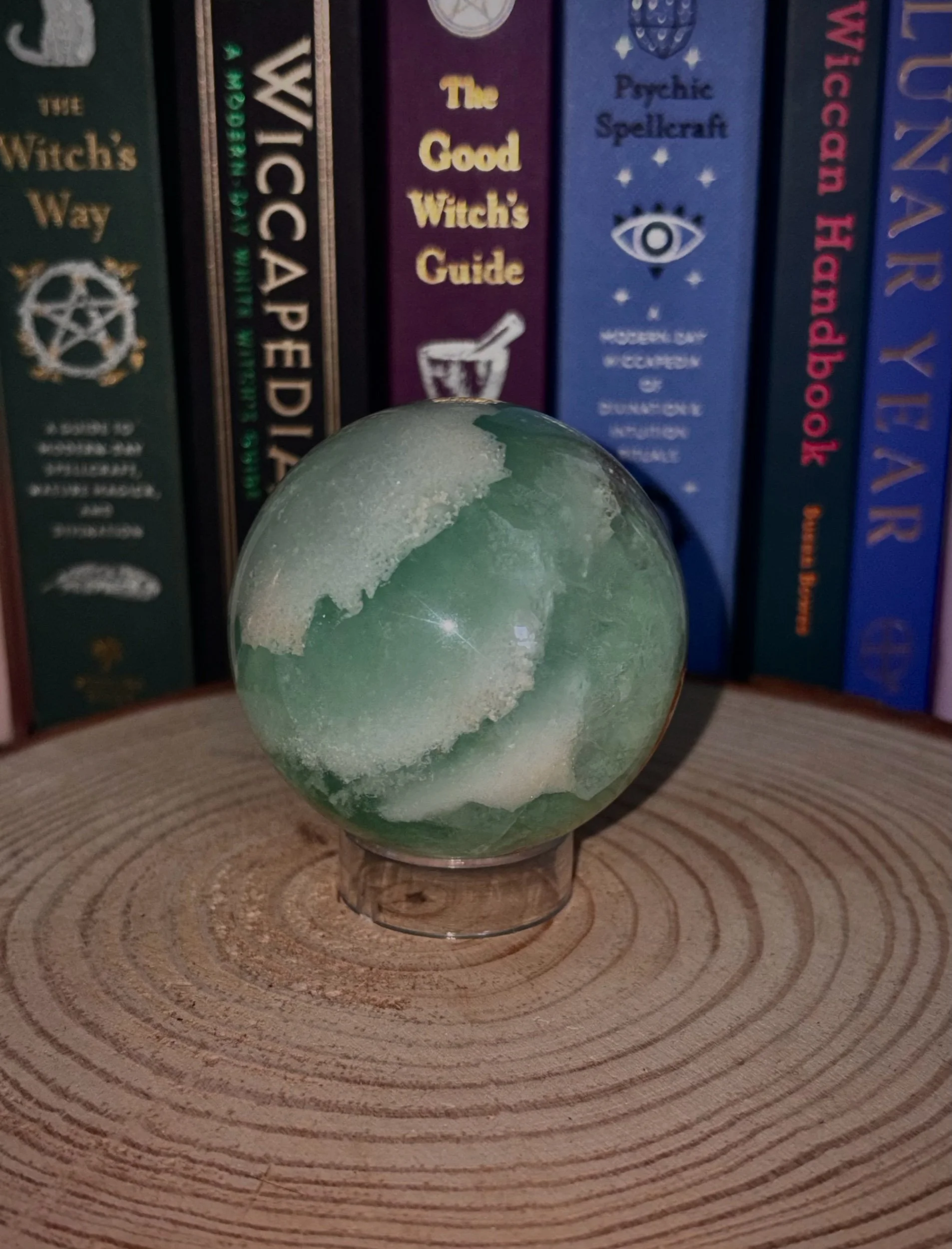 This green fluorite sphere carries soft, soothing tones of green — sometimes layered with gentle translucency that seems to glow from within. Each piece is unique, with natural variations that give it a tranquil, almost ethereal presence.